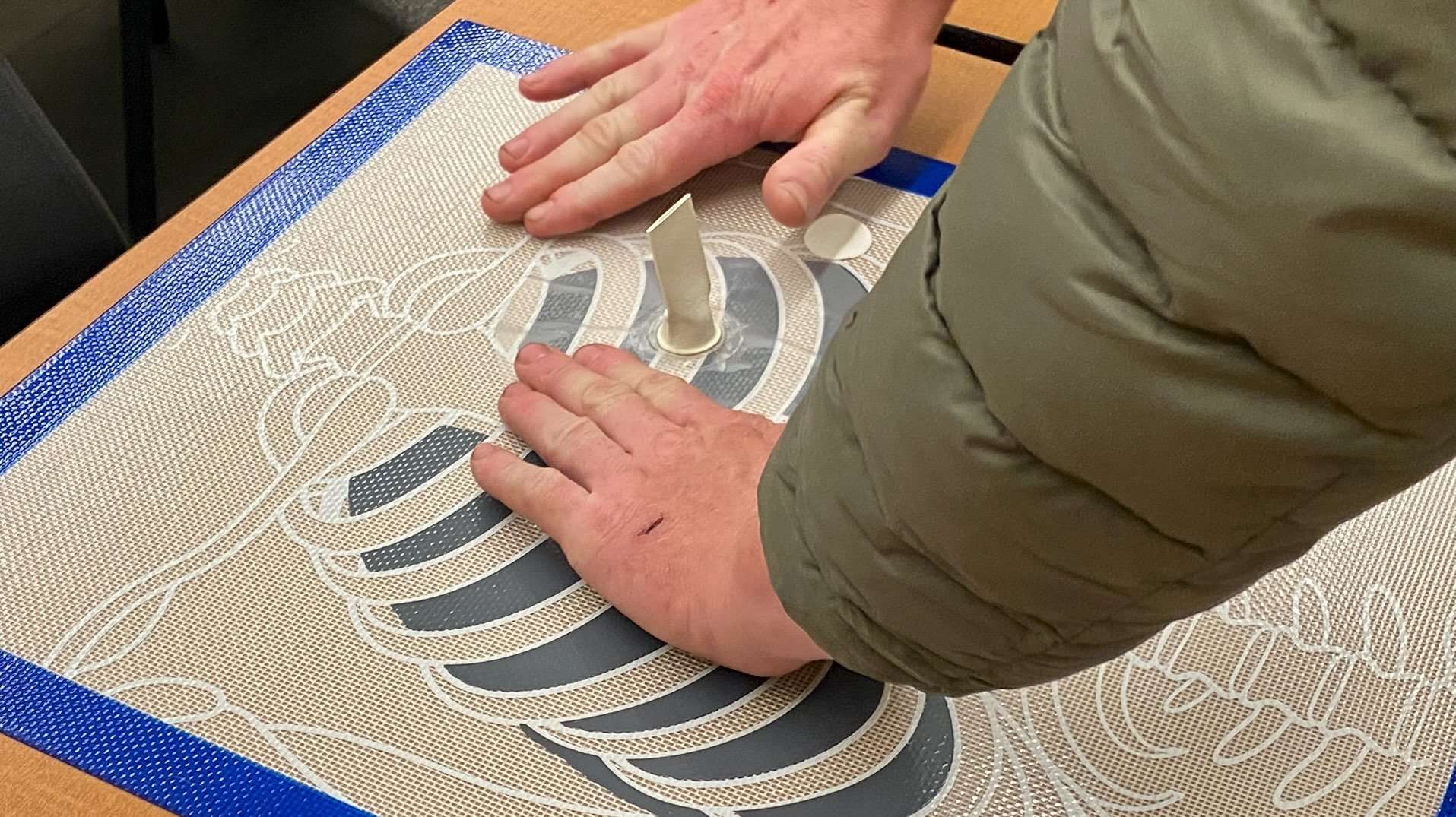 The first thing you may be wondering is what the heck is this thing? This is a very simple tool that promotes training of a greatly overlooked skill. Because it is as simple as “put a sticker on it,” applying chest seals is rarely practiced. That’s where the Chest Seal Trainer comes in. It is essentially one of those magic silicon baking pads that somehow doesn’t melt in the oven, but keeps bread, cookies, and other baked goods from sticking to the pan. It’s flexible, non-stick, and has an anatomically-correct representation of the ribcage, heart, and lungs. At 16” wide and 20” it is pretty similar in size to the anatomy of an adult.